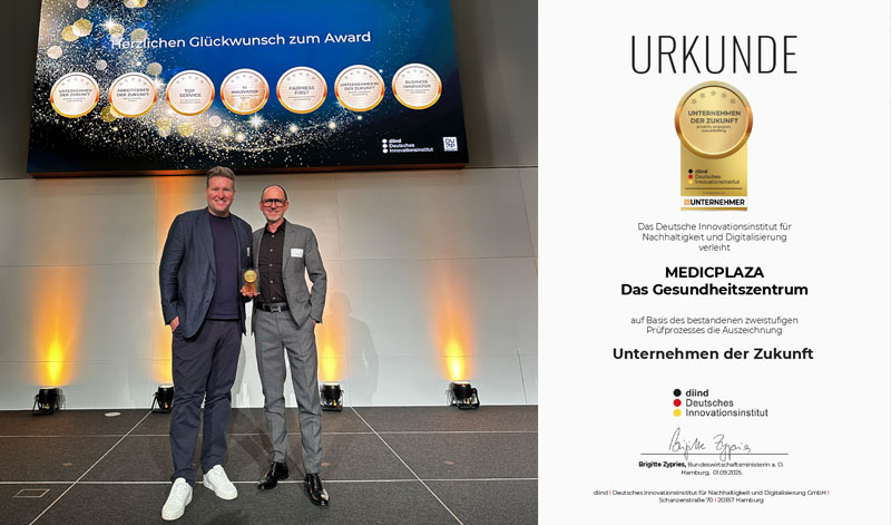 Das MEDICPLAZA wurde vom diind – Deutsches Innovationsinstitut für Nachhaltigkeit und Digitalisierung als „Unternehmen der Zukunft“ ausgezeichnet. Die Ehrung basiert auf einem zweistufigen Prüfprozess und würdigt Unternehmen, die Innovationskraft, nachhaltiges Handeln und Zukunftsorientierung erfolgreich verbinden.